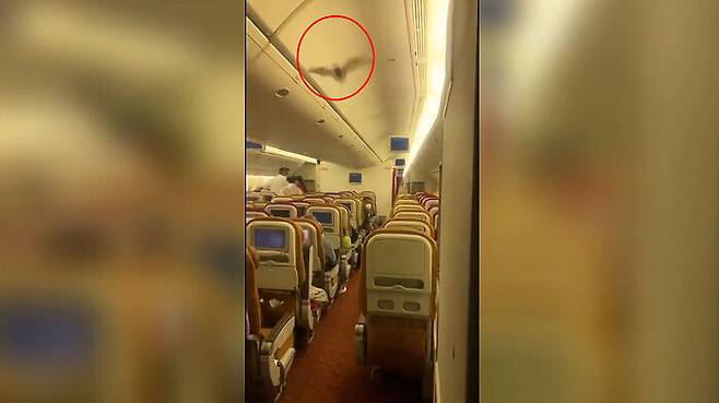 여객기 천장에서 무언가 빠르게 날아가는 모습을 볼 수가 있는데요, 날개를 빠르게 퍼덕이면서 기내 여기저기를 날아다니는 것은 다름 아닌 박쥐였습니다.