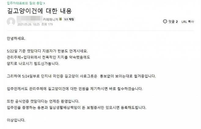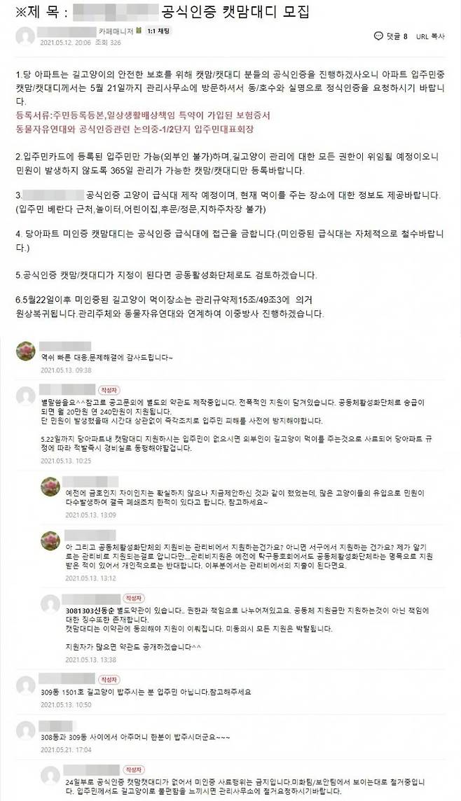 길고양이 보호를 위해 주민등록등본과 일상생활배상책임 특약이 가입된 보험증서를 제출하고 단지 내 공식 캣맘·캣대디로 선정되면 고양이 관리에 대한 모든 권한을 위임하고 연간 240만원씩 지원하겠다는 내용이다. 단, 입주민만 지원 가능하며 길고양이에 의해 발생하는 모든 민원을 책임져야 한다는 조건이 달렸다.