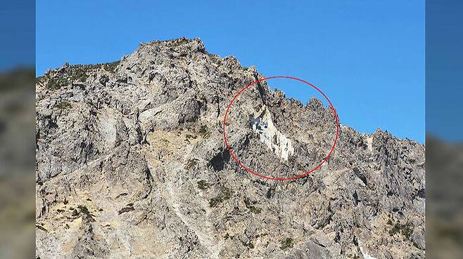 검은 바위들 사이로 하얗게 칠해놓은 듯한 부분이 보이는데요, 한라산국립공원관리소와 한라산연구부에 따르면 한라산 윗세오름 코스를 거쳐서 남벽 분기점에 이르기 전에 보이는 해발 약 1천800m 높이의 백록담 남서쪽 암벽 일부가 무너져 내린 것으로 확인됐습니다.