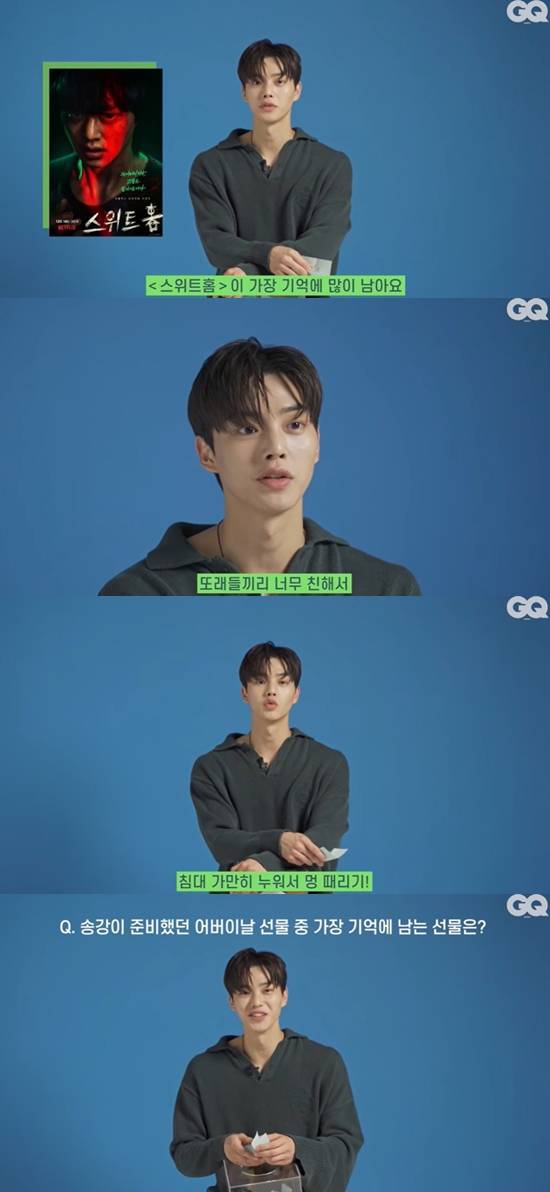 가장 기억에 남는 작품으로는 넷플릭스 '스위트홈'을 꼽았다. 송강은 "현장에서도 너무 재밌었고 또래들끼리 친해서 서로 의기투합하면서 같이 이끌어나갔던 기억도 좋았다. 매 순간 새로운 연기를 한 것 같아서 기억에 남는다"라고 대답했다. 이어 "8부 엔딩에 재헌이 형이 죽는 신이 있는데, 그 장면이 너무 슬펐던 기억이 있다"라고 덧붙였다.