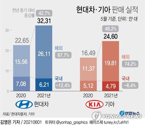 (서울=연합뉴스) 김영은 기자 = 현대차는 5월 국내 6만2천56대, 해외 26만1천73대 등 총 32만3천129대를 판매했다고 1일 밝혔다.