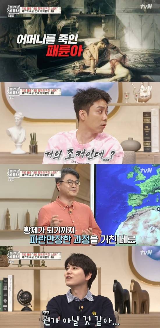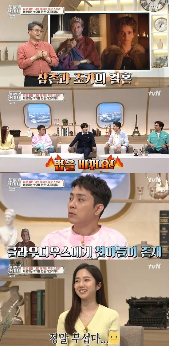 이어 김헌 교수는 "그리고 네로 어릴 때 아버지가 돌아가셔서 황실 가문이지만 후계자로는 주목받지 못했다. 그래서 아그리피나는 자신의 자식 네로를 황제로 만들기위한 치밀한 계획을 실행했다"며 "네로의 삼촌이었던 칼리굴라가 죽자 그때 황제가 됐던 사람이 클라우디우스다. 그는 4번의 결혼을 했는데 세 번째 아내가 불륜을 저질렀다"라고 말해 놀라움을 자아냈다.