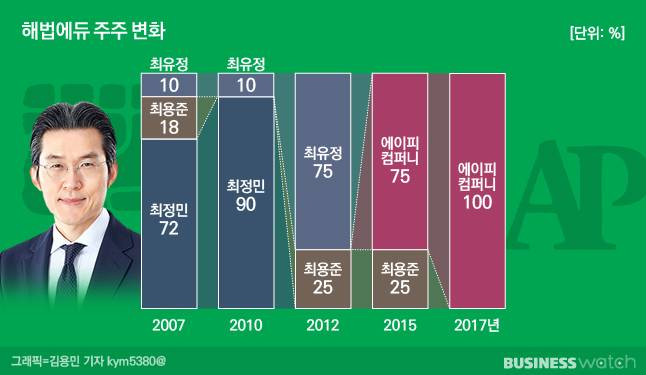 2015년 지배구조가 또 바뀐다. 다시 최 회장의 수중으로 들어갔다. 이때 최 회장이 지분 80%를 쥐고 있던 에이피컴퍼니 등장한다. 당시 해법에듀의 1대주주로 있던 최 전 감사의 지분 75% 전량을 69억원을 주고 사들였다.
