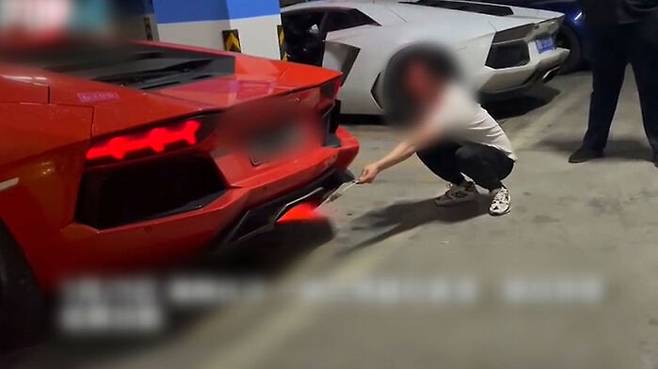 지난달 29일, 중국 후난성의 한 지하주차장입니다. 한 남성이 람보르기니 배기구에 고기를 꽂은 긴 꼬챙이를 갖다 대고 있습니다.