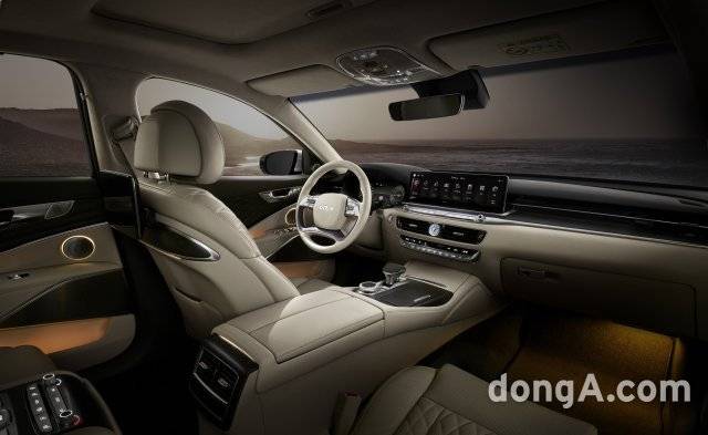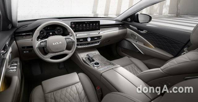 실내는 14.5인치 초대형 와이드 디스플레이를 탑재해 웅장하면서 미래지향적인 느낌을 완성했다고 한다. 기아 측은 탑승자 시선이 편안하게 머무를 수 있는 레이아웃에 섬세한 소재와 첨단 사양이 조화를 이룬다고 설명했다. 새로운 소재로 오베체 엔지니어 리얼우드와 시카모어 리얼우드를 크러쉬패드와 도어트림, 콘솔 등에 적용했다. 오베체 엔지니어 리얼우드는 인테리어에 많이 사용되는 오베체 우드를 층층이 쌓아 만든 패턴이다. 시카모어 리얼우드는 방향에 따라 다양한 이미지를 연출하는 시카모어 우드를 통해 타이거 패턴을 은은하게 보여준다고 한다. 이밖에 새로운 디자인의 퀼팅 패턴 시트와 스트레칭 모드를 추가한 에르고 모션 시트 등이 더해졌다.