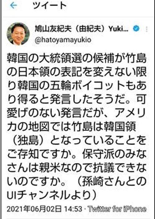 하토야마 전 총리는 2일 자신의 트위터 계정에 "한국 대선 후보가 다케시마)의 일본령 표기를 바꾸지 않으면 한국의 올림픽 보이콧도 있을 수 있다고 발언했다고 한다"면서 일본 입장에선 거북한 발언이지만 "미국 지도에 다케시마가 한국령(독도)으로 돼 있는 것을 알고 있는가"라고 반문하는 글을 올렸습니다.