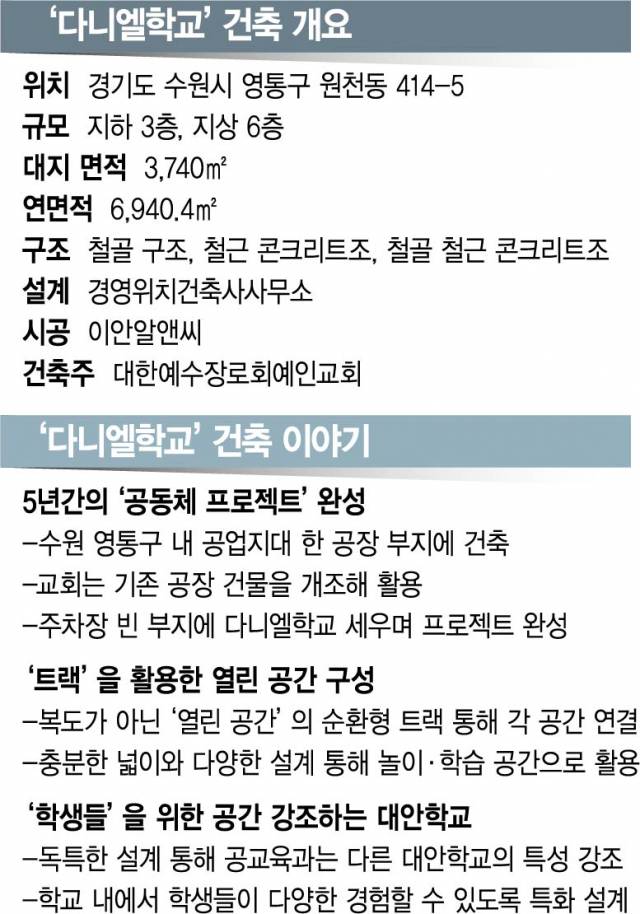 수원 영통구 공업지대 한복판에는 보기 드문 건물이 들어서 있다. 거대한 미술관처럼 타원형의 저층부가 일단 눈길을 끈다. 여기에 한 번 더 놀라게 되는 사실은 이 건물이 학교라는 것이다. 수원예인교회에서 운영하는 대안학교 ‘다니엘학교’가 이번 기사의 주인공이다.
