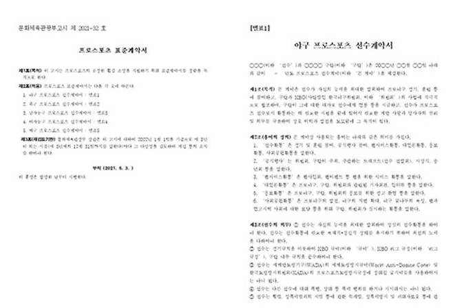 문체부는 지난해 12월 스포츠산업 진흥법을 개정해 프로스포츠 표준계약서의 법적 근거를 마련한 뒤 한국프로스포츠협회, 법무법인 세종과 프로스포츠 표준계약서 도입을 추진했습니다.