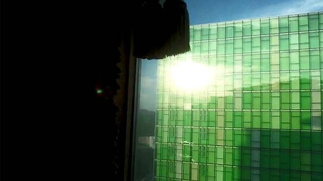 네이버 사옥 외벽에 태양광이 들이치자, 반사광은 맞은편 아파트로 향합니다.