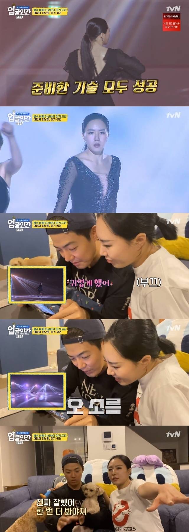 앞서 공연을 하루 앞두고 "너무 예민해서 그만했음 좋겠다"고 의견을 내비쳤던 강남은 무대 영상을 보며 "너무 예쁘다. (동작이) 부드럽다. 옷도 날아다닌다. 소름이 돋는다"며 칭찬을 아끼지 않았다. 강남은 스핀이 잘 되지 않는다고 토로하는 이상화에겐 "귀엽게 했다"고 반응해 아내를 미소짓게 만들었다.
