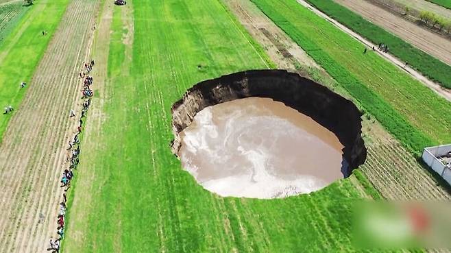 들판 한가운데가 마치 거대한 저수지를 만들어 놓은 듯 동그랗게 파였는데요, 지난달 29일 싱크홀이 처음 생길 때만 해도 지름이 5m 정도였다고 합니다. 이튿날 30m 정도로 넓어지더니 지금은 100m를 넘는 거대한 싱크홀이 됐습니다.