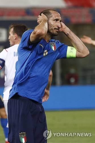 epa09248560 Italy's Giorgio Chiellini reacts during the international friendly soccer match between Italy and the Czech Republic at Renato Dall'Ara stadium in Bologna, Italy, 04 June 2021. EPA/ELISABETTA BARACCHI