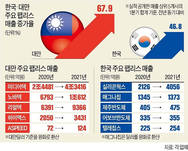 자국 정부와 파운드리의 강력한 지원을 받은 대만 팹리스의 입지가 강화되고 있는 건 실적으로 나타난다. 한국경제신문이 한국과 대만 팹리스 중 각각 상위 5개사의 올 1분기와 지난해 1분기 실적을 비교한 결과 매출 격차가 크게 벌어졌다. 미디어텍, 노바텍, 리얼텍 등 대만 팹리스 다섯 곳의 1분기 매출 합계는 6조6949억원(원화 환산)으로 실리콘웍스 등 한국 상위 5개 업체의 총매출(6513억원)보다 6조436억원(928%) 많다. 지난해 1분기엔 대만 3조9787억원, 한국 4436억원으로 격차가 3조5351억원 수준이었다. 업계에선 팹리스의 ‘파운드리 확보 능력’, 즉 반도체 물량 확보 여부를 매출 격차의 원인으로 꼽는다.