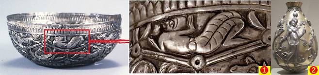 황남대총 북분에서 확인된 5~6세기 은제잔은 어떻습니까. 여인 한 사람이 조각돼 있는데요. 이 여인은 이란의 아나히타(Anahita) 여신상과 흡사합니다. 아나히타는 풍요와 전쟁, 농경을 관장하는 여신입니다.