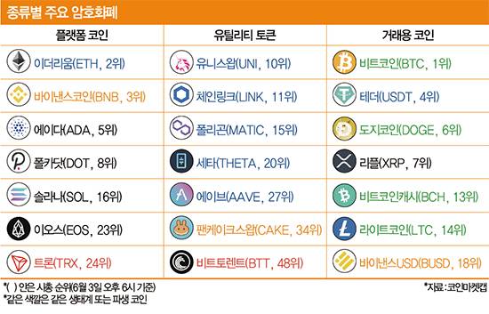 플랫폼 코인의 대표 주자는 역시 이더리움(ETH)이다. 바이낸스코인(BNB·시총 3위), 테더(USDT·4위), 체인링크(LINK·11위) 등 굵직굵직한 코인이 처음에는 모두 이더리움 유틸리티 토큰으로 출발했다.