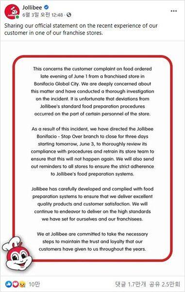 페레스 씨가 게시한 영상이 온라인상에서 10만 회 가까이 공유되며 공분을 불러일으키자, 치킨 프랜차이즈 측은 공식 사과문을 발표했습니다.