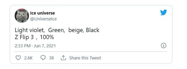 아이스유니버스는 트위터를 통해 "라이트 바이올렛, 그린, 베이지, 블랙. Z플립3 100%"라고 밝혔다. 흥미롭게도 그가 공개한 컬러는 지난 달 유출된 삼성전자 마케팅 자료 이미지에도 등장했다.