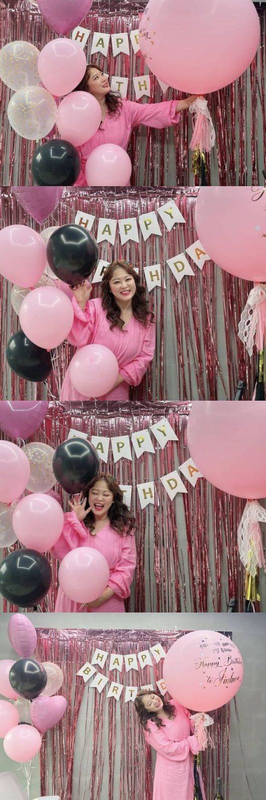 공개된 사진에는 심진화가 가랜드와 벽 장식, 풍선에 원피스까지 핑크색으로 도배된 생일 축하 파티 현장에 있는 모습이 담겼다.