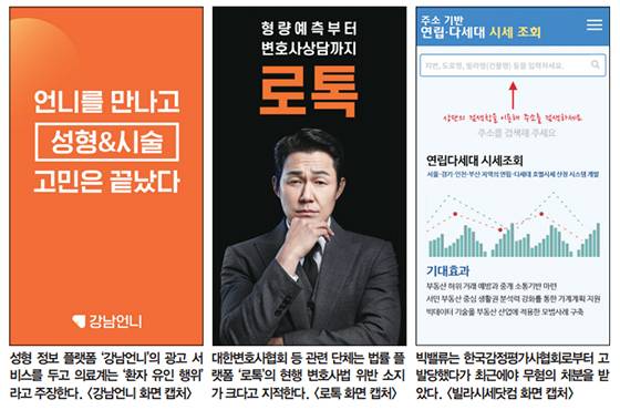 ‘강남언니(힐링페이퍼)’ ‘바비톡(케어랩스)’ 같은 성형·미용 정보 플랫폼과 의료계 간 갈등도 비슷한 맥락이다. “병원을 소개해주고 대가를 받는 서비스가 불법이며 성형·미용 플랫폼에도 광고 사전 심의 대상을 확대해야 한다”는 대한의사협회 주장과 “합법적인 광고업이며 협회 심의 기준은 객관성과 일관성이 떨어진다”는 플랫폼 측 주장이 엇갈리는 상황이다.