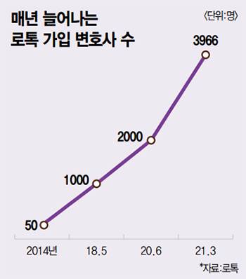 로톡에는 올해 초 기준 4000명가량의 변호사가 가입해 있다. 전체 변호사 3만명 시대에 상당한 비율이라 할 수 있다. 더불어 대한변호사협회는 로톡을 통한 거래액도 1000억원대를 넘어섰을 것으로 추정한다.
