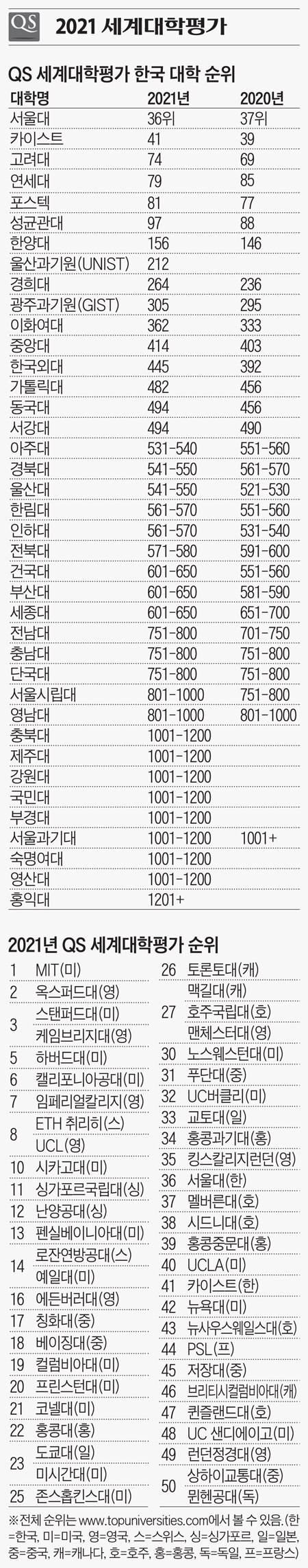 2003년 QS 세계대학평가가 시작된 이후 올해로 18년째 한국 대학은 톱 30위 안에 들지 못했다. 역대 최고 순위는 2014년 31위(서울대)다. 이에 비해 싱가포르는 톱10 진입을 눈앞에 둔 싱가포르국립대(11위)와 난양공대(12위)를, 중국은 칭화대(17위)와 베이징대(18위)를 30위 안에 올렸다. 일본은 도쿄대(23위)가 톱 30에 들었다. MIT(매사추세츠공대)가 10년 연속 1위를 지켰고, 옥스퍼드대는 2위에 올랐다. 스탠퍼드대와 케임브리지대는 공동 3위로 집계됐다. 김보원 카이스트 부총장은 “초일류 대학이 국가 경쟁력의 척도로 평가받는 시대에 지난해 GDP(국내총생산) 기준 세계 9위 경제 규모의 한국이 30위 내 대학을 내지 못하는 것은 문제”라며 “경쟁력을 끌어올릴 대책이 시급하다”고 했다.