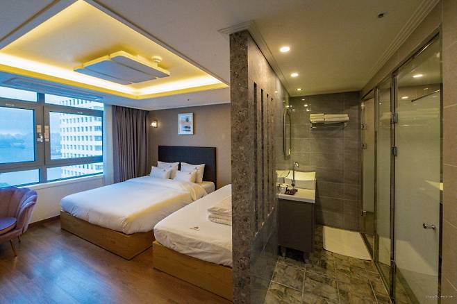위치뿐만 아니라 깔끔한 객실과 편안한 서비스, 각종 편의시설을 갖췄으며, 객실 수도 133개로 여유롭기 때문이다. 객실은 따뜻한 톤의 백열등과 원목 인테리어로 편안한 분위기를 조성했다. 커다란 통유리 창으로 들어오는 햇빛이 화사한 느낌을 더한다. 노트북을 사용하기 적절한 책상과 1인용 안락의자와 작은 테이블도 알차게 갖췄다. 1층에는 편의점과 카페, 마사지숍 등이 입점해 있으며, 최대 300명까지 수용 가능한 연회장과 24시간 운영되는 피트니스 센터 등의 부대시설도 있다. 사실상 특급 호텔과 견주어도 부족하지 않다.