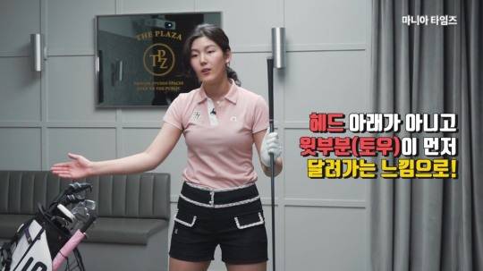 이때 포인트는 임팩트 전 클럽이 휘어지는 느낌을 받으면서 클럽 헤드의 머리 부분인 토우 쪽이 먼저 나갈 수 있도록 하는 것이다.