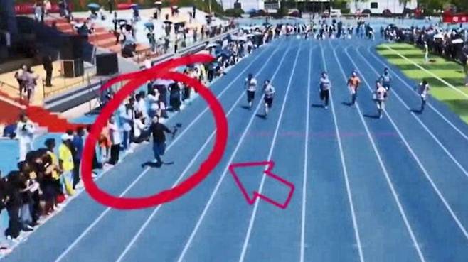 중국의 한 대학 육상 경기에서 선수보다 빠른 카메라맨이 등장을 해 눈길을 끌었습니다.
