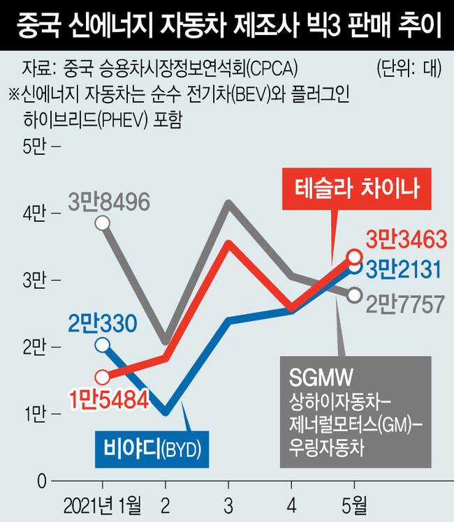 중국의 지난 5월 순수 전기차와 플러그인 하이브리드(외부 충전이 가능한 하이브리드 자동차) 등 신에너지 승용차 판매량은 19만6천대로 4월보다 7% 증가했다. 테슬라의 판매 증가세(30%)가 두드러진 셈이다.