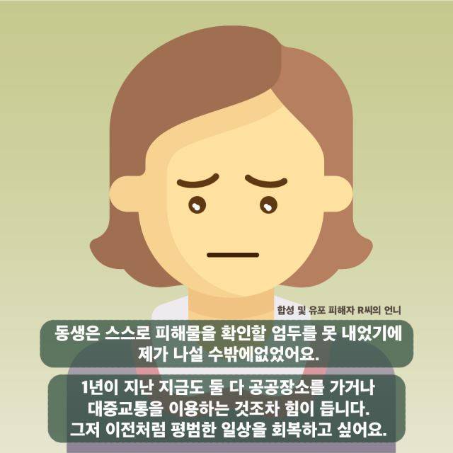 피해자 연대를 결성해 국민청원을 진행했다. 그 과정에서 SNS 계정을 해킹당하기도 했고, 나와 동생의 신상정보가 온라인에 노출되기도 했다. 휴대전화 번호도 여러 번 바꿨고, 노트북이나 휴대전화를 수시로 초기화했다. 전자기기의 카메라를 항상 가리고 사용했고 IP 우회 서버를 유료로 사용했다. 동생의 사진이 다른 어디에 퍼져있지 않을까 싶은 두려움에, 매일 밤 구글 등 검색 엔진을 통해 동생의 이름, 신상정보를 검색했다. 발견할 때마다 가슴이 철렁했다. 동생이 보면 어떡하나 싶은 불안한 마음과 함께, 사진을 올린 가해자들에 대한 증오가 솟구쳐 올랐다. 사진과 정황을 채증해 경찰에 신고하는 동시에 삭제 지원 센터에도 삭제를 요청하고 싶었지만 그럴 수 없었다. 증거가 삭제되면 수사에 차질이 생긴다는 경찰의 말에 혼란이 왔다. 결국 동생과 나는 사진 삭제와 수사 중 선택을 해야 했다. 신고해서 가해자를 잡고 싶은 마음과, 온라인상에서 하루라도 빨리 동생의 사진을 삭제하고 싶은 마음 중 무엇이 우선돼야 할지 혼란스러웠다.