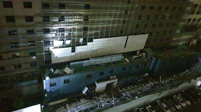 오늘(11일) 오전 1시 55분쯤 서울 서초구 반포동의 쉐라톤 팔레스호텔 철거 현장에서 시스템 비계(높은 곳에서 작업할 수 있도록 설치하는 일체형 작업발판)가 인근 아파트 주차장 쪽으로 쓰러지는 사고가 일어났습니다.
