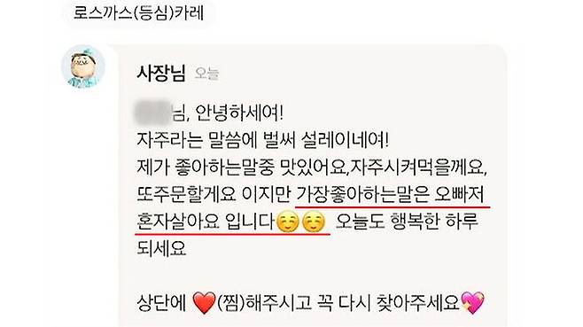 '맛있어요', '또 주문할게요'라는 말도 좋아하지만 가장 좋아하는 말은 '저 혼자 살아요'라고 쓴 것입니다. 음식과 전혀 상관이 없는 내용이죠.