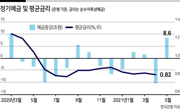 11일 한국은행의 ‘5월중 금융시장 동향’에 따르면 지난달 은행의 정기예금(정기적금 포함)은 8조6000억원 증가, 전월대비 1.2% 상승했다. 5월 정기예금 증가폭은 작년 3월(10조2000억원) 이후 최대 수준으로 이로써 예금 잔액은 다시 700조원을 넘어섰다.