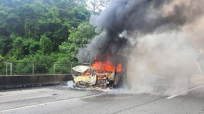 또 사고 직후 화재가 발생해 25톤 트레일러와 유도 차량이 전소됐고 1시간 만에 진화됐습니다.