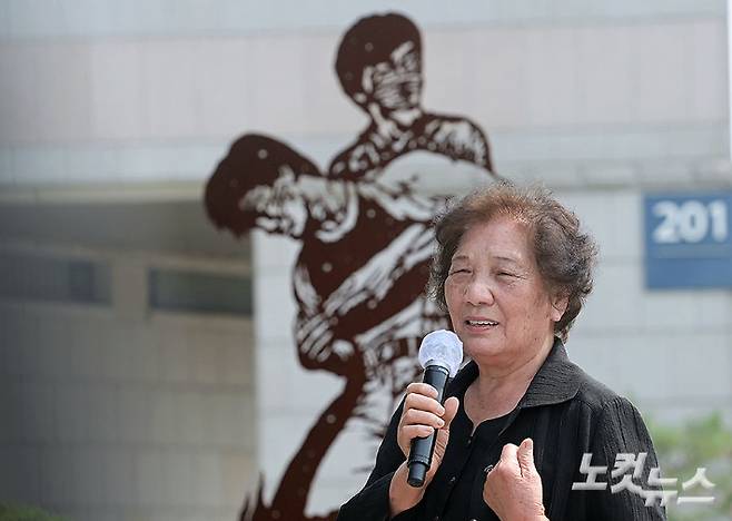 9일 서울 서대문구 연세대학교 한열동산에서 열린 고 이한열 열사의 34주기 추모식에서 이한열 열사의 모친 배은심 여사가 인사말을 하고 있다. 이한형 기자