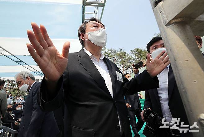 윤석열 전 검찰총장이 9일 오후 열린 서울 남산예장공원 개장식에서 '윤석열 대통령'을 연호하는 지지자들에게 자제를 당부하고 있다. 한편 10일 법조계에 따르면 고위공직자범죄수사처(공수처)는 유력 대권주자로 부상한 윤 전 총장을 직권남용권리행사방해 등 혐의로 정식 입건해 수사하고 있다. 황진환 기자