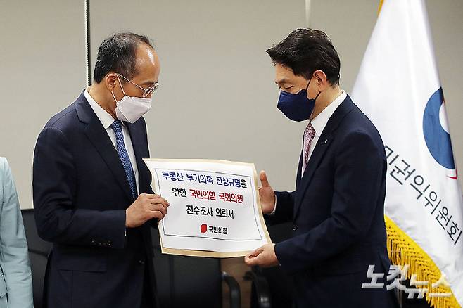 국민의힘 추경호 원내수석부대표가 11일 오전 정부서울청사 국민권익위원회를 방문, 김태응 부동산거래특별조사단장에게 국민의힘 소속 국회의원 부동산거래 전수조사 의뢰서를 전달하고 있다. 황진환 기자