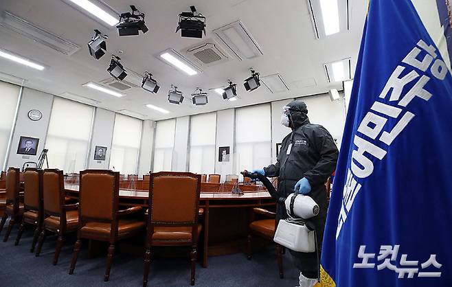더불어민주당에서 코로나19 확진자가 4명 발생한 11일 국회 더불어민주당 당대표 회의실에 방역 소독이 실시되고 있다. 송영길 대표는 대표실 보좌진이 확진 판정을 받음에 따라 코로나19 검사를 받을 계획이다. 오전 예정됐던 최고위원회의를 비롯해 이날 송 대표의 모든 일정은 전면 취소됐다. 윤창원 기자