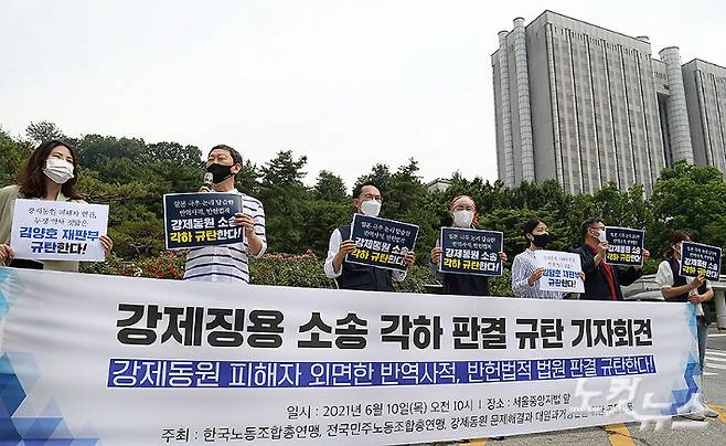 10일 서울 서초구 서울중앙지법 앞에서 열린 '강제징용 소송 각하 판결 규탄 기자회견'에서 강제동원공동행동 관계자들이 손피켓을 들고 있다. 법원은 지난 7일 강제징용 피해자들이 일본 기업들을 상대로 소송을 낼 권한이 없다는 판결을 내렸다. 서울중앙지법 민사합의34부(김양호 부장판사)는 강제징용 노동자와 유족 85명이 일본제철·닛산화학·미쓰비시중공업 등 일본 기업 16곳을 상대로 낸 소송을 각하했다. 이한형 기자