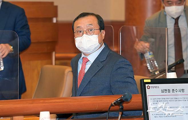 재판 개입 의혹이 불거진 임성근 전 부장판사가 10일 오후 종로구 헌법재판소에서 열린 본인의 탄핵소추 사건 첫 변론기일에 출석. 피청구인석에 앉아 재판을 기다리고 있다. 이한형 기자