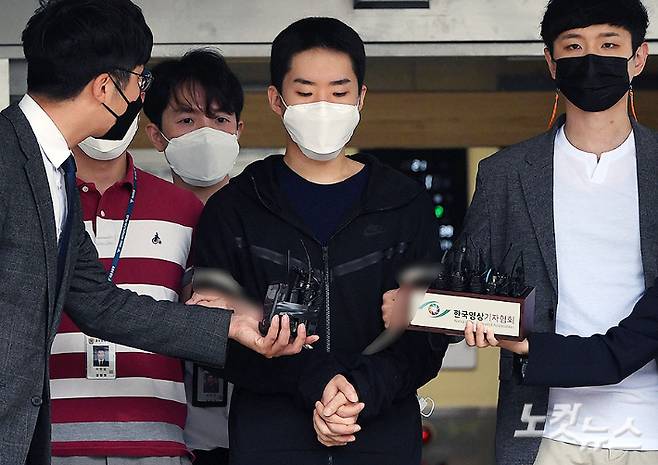 8년에 걸쳐 남성 1천300여명의 알몸 사진·영상(일명 '몸캠') 등을 유포한 혐의로 구속된 김영준(29)이 11일 오전 서울 종로경찰서에서 검찰로 송치되고 있다. 호송차에 실리기 전까지 시선을 계속 바닥에만 둔 김 씨는 '신상공개가 결정됐는데, 마스크를 잠깐 내려줄 수 있나'라는 취재진 요청은 거부했다. 황진환 기자