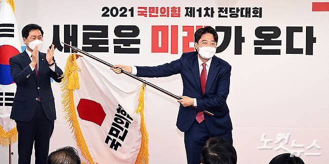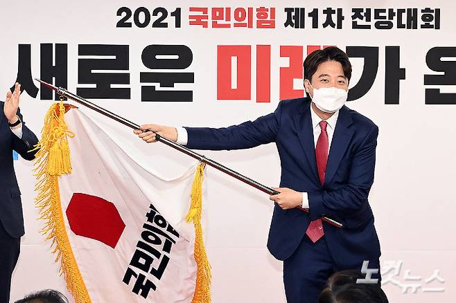 이준석 국민의힘 대표 당선자가 11일 오전 서울 영등포구 여의도동 국민의힘 당사에서 열린 전당대회에서 당기를 흔들고 있다. 국민의힘은 이날 중앙당사에서 전당대회를 열고 새 당대표로 이준석(36) 후보가 합산 득표율 43.82%로 최종 선출됐다고 밝혔다. 2위는 나경원 후보로 합산 득표율 37.14%로 집계됐다. 이어서 주호영 후보(14.02%), 조경태 후보(2.81%), 홍문표 후보(2.22%) 순이었다. 윤창원 기자