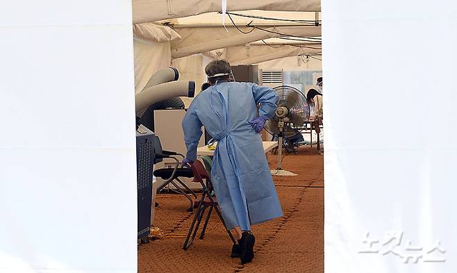 천막 안 의료진 '의지할 곳은 오로지 냉풍기 앞'