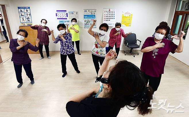 코로나19 백신 1차 및 2차 접종을 완료한 어르신들이 7일 오후 서울 양천구 만수경로당에서 경로당 실내프로그램 중 하나인 댄스교실에 참여해 실력을 뽐내고 있다. 코로나19로 인해 중단됐던 만수경로당 댄스교실이 재개된 것은 작년 2월 이후 약 1년 4개월 만이다. 황진환 기자