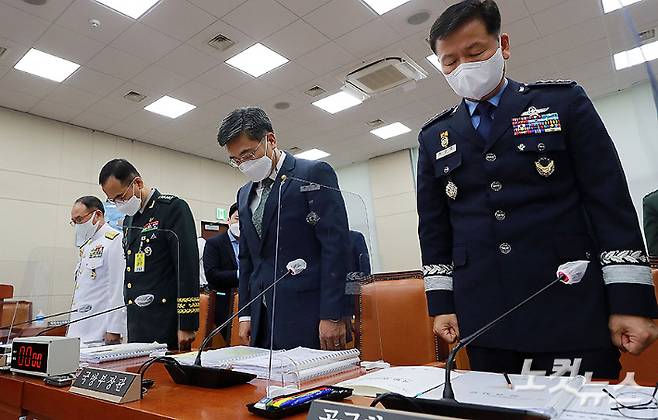 서욱 국방부 장관(오른쪽 두번째)이 9일 국회에서 열린 국방위원회 전체회의에서 성추행 피해 신고 뒤 극단적 선택을 한 공군 중사를 추모하며 묵념하고 있다. 오른쪽부터 정상화 공군참모차장, 서욱 장관, 남영신 육군참모총장, 부석종 해군참모총장. 윤창원 기자