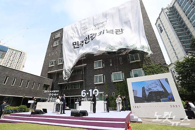 제34주년 6·10 민주항쟁 기념식이 열린 10일 서울시 용산구 옛 남영동 대공분실 자리에 민주인권기념관 착공 행사가 진행되고 있다. 황진환 기자