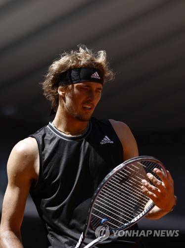 epa09262347 Alexander Zverev of Germany in action against Stefanos Tsitsipas of Greece during their semi final match at the French Open tennis tournament at Roland Garros in Paris, France, 11 June 2021. EPA/YOAN VALAT