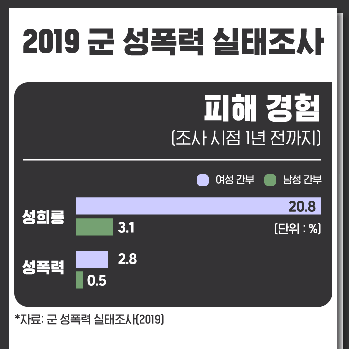군대 내 성폭력은 '예민하고' '고분고분하지 않은' 일부의 문제였을까? '2019년 군 성폭력 실태조사' 보고서에 따르면 여성 군인 10명 중 2명이 성폭력 피해를 경험했다고 답했다. 성범죄 피해 경험이 있는 여군의 절반가량은 피해 사실을 신고하지 않고 속으로만 삭였다.