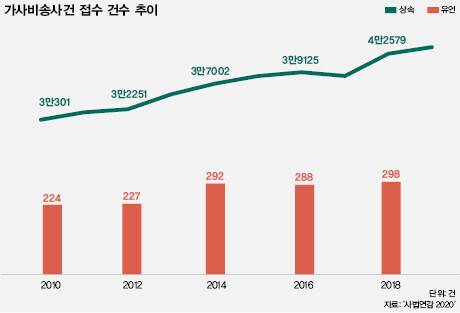 대법원의 ‘사법연감 2020’ 통계를 살펴보면 상속 사건은 2010년 3만301건에서 2019년 4만3799건, 유언 사건은 2010년 224건에서 2019년 323건으로 꾸준히 늘고 있다(그림 참조). 반면 재판상 이혼 소송은 2010년 4만5351건에서 2019년 3만5228건으로 크게 줄었다. 엄경천 변호사(법무법인 가족)는 “과거에는 이혼 사건과 상속 사건의 비중이 8 대 2였다면, 지금은 비슷한 비중”이라며 “부동산 가치가 급등하고 전통적인 가족 개념이 사라졌기 때문으로 보인다”고 설명 했다.