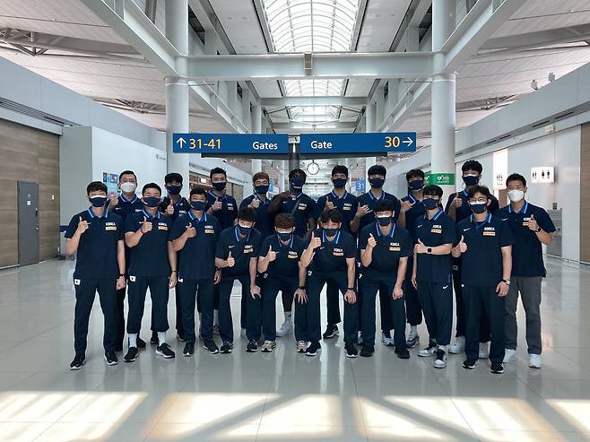 (서울=연합뉴스) 1996년 애틀랜타 대회 이후 25년 만에 올림픽 본선 진출을 노리는 남자농구 국가대표팀이 13일 필리핀으로 출국했다. 2021.6.13 [대한민국농구협회 제공. 재판매 및 DB 금지]
